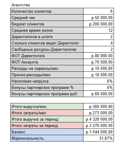 Ну и финальный пример - расчёт небольшого агентства контекстной рекламы, где в штате, кроме вас работают два директолога и аккаунт.