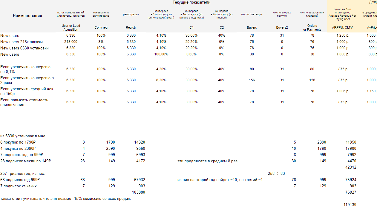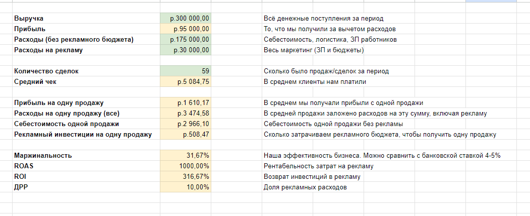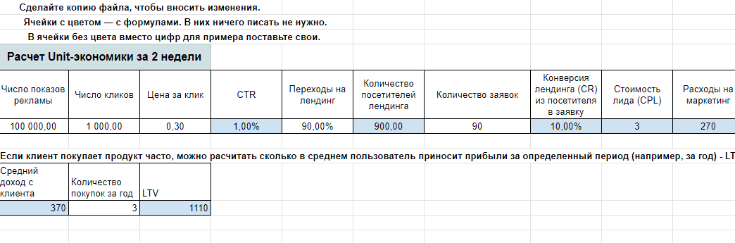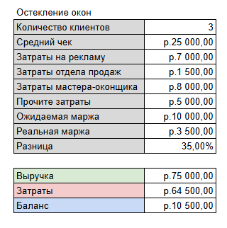 В данном примере мы считаем несколько клиентов (юнитов), ARPC (Average Revenue per Customer) — средний доход на клиента, затраты на привлечения каждого (рекламу), затраты ФОТ (отдела продаж и мастер-оконщик), иные расходы + добавили пункт "Ожидаемая маржа", которая с реальной, при этих показателях не сильно-то совпадает.