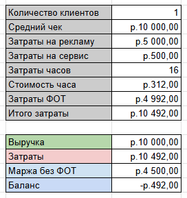 Наша Оксана продаёт аудит и оформление группы ВКонтакте. Стоит эта услуга 10 000 рублей. Если сейчас не считать дальше, то кажется, что у нее большое финансовое будущее, ведь из 10 000 рекламного бюджета она сделала 20 000 выручки. Но нашей Оксане еще надо оказать услугу, поэтому надо посчитать сколько времени она это потратит, сколько это время стоит и сколько сопутствующих расходов будет.